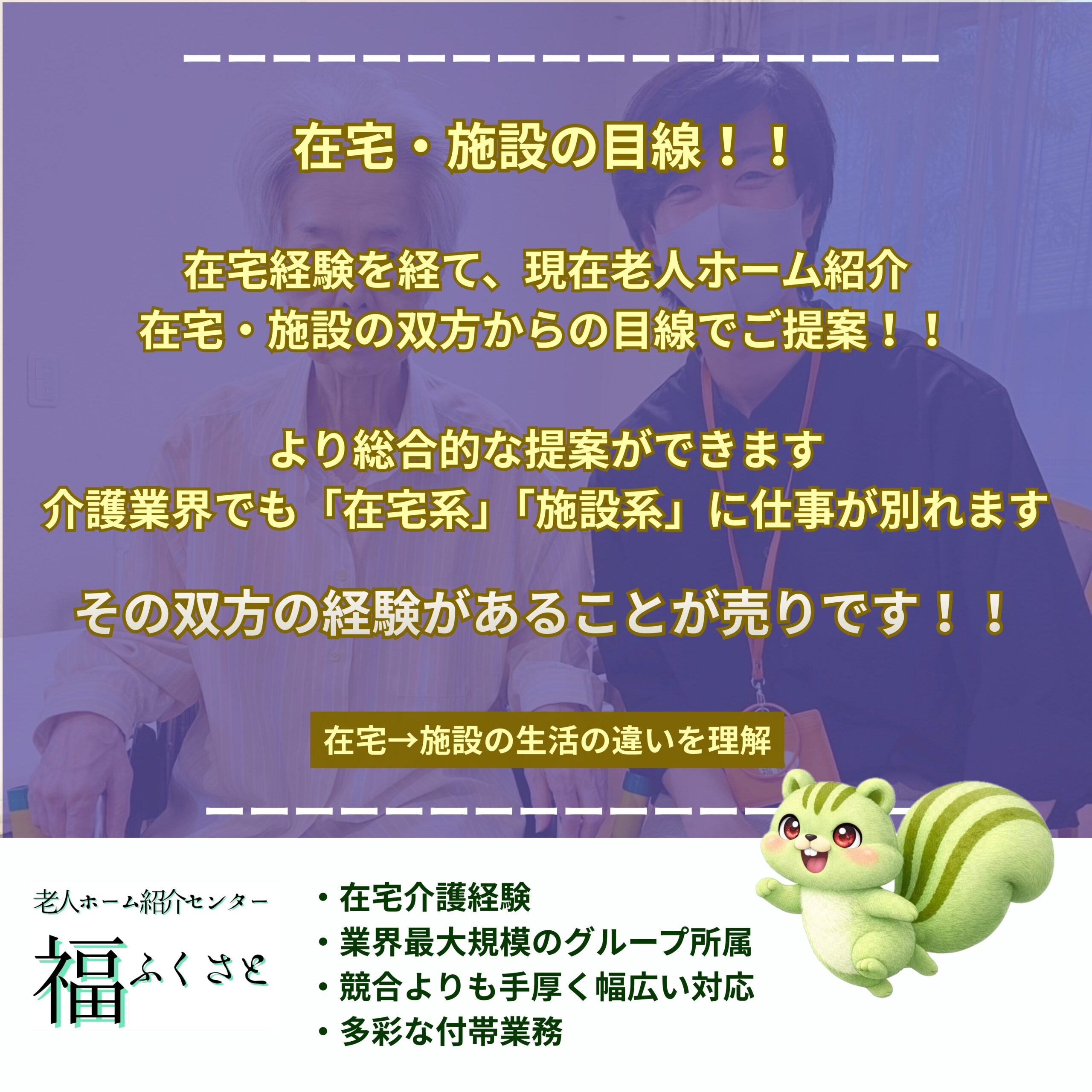 より総合的な提案ができます。介護業界でも「在宅系」「施設系」に仕事が別れます。