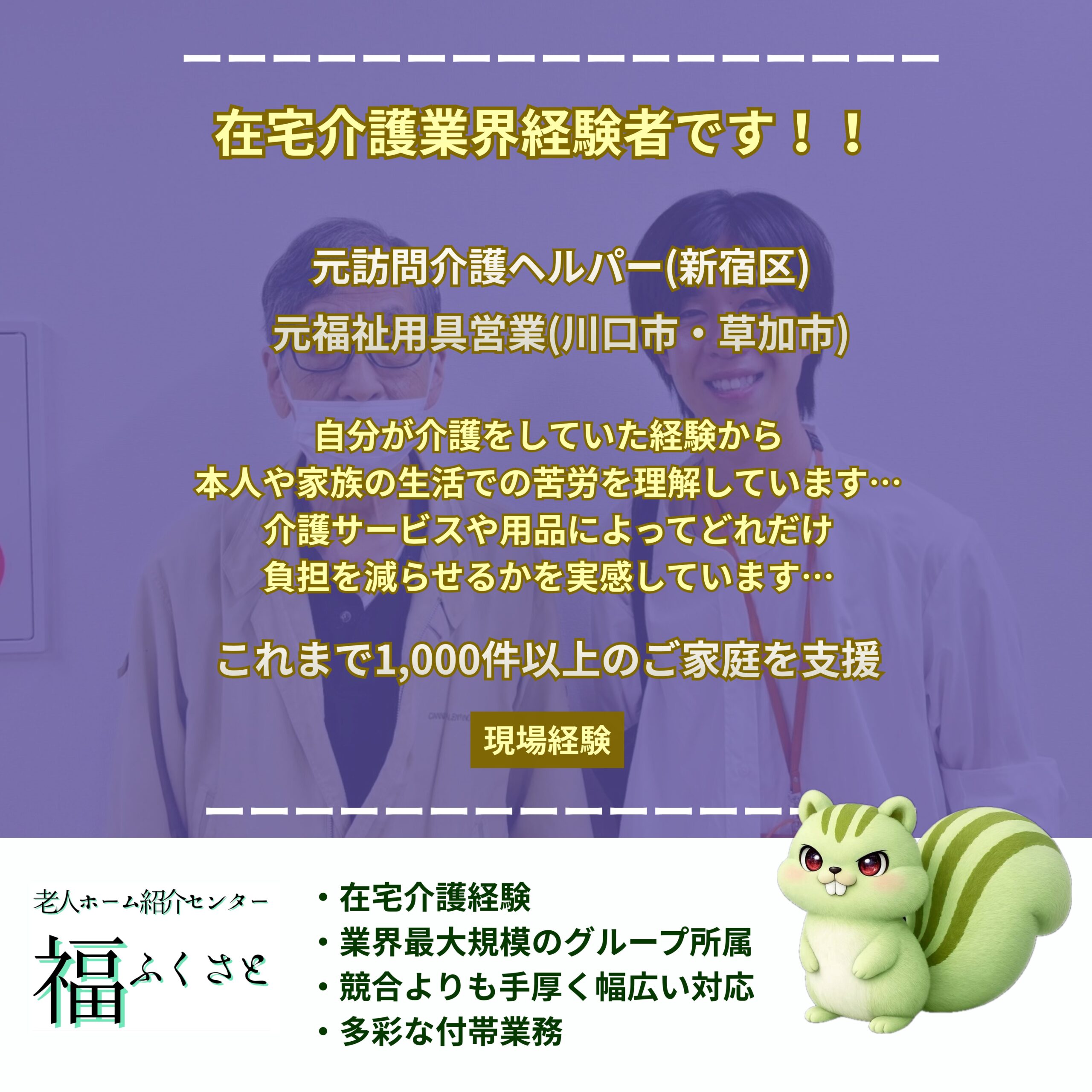 在宅経験を経て、現在老人ホーム紹介をしております。